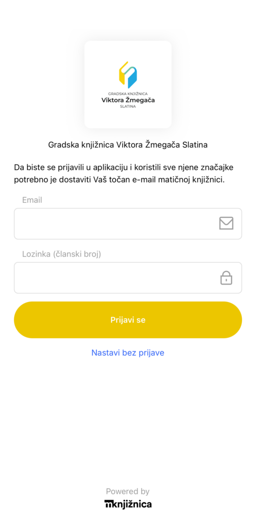 Prva prijava u aplikaciju, kao i prijava nakon ažuriranja vrši se upisivanjem email adrese koju ste naveli pri učlanjivanju u našu Knjižnicu. Također, nužno je unijeti i lozinku odnosno vaš članski broj uz prefiks 00 (dvije nule). Na primjer: mail.adresa@gmail.com, lozinka: 001111.