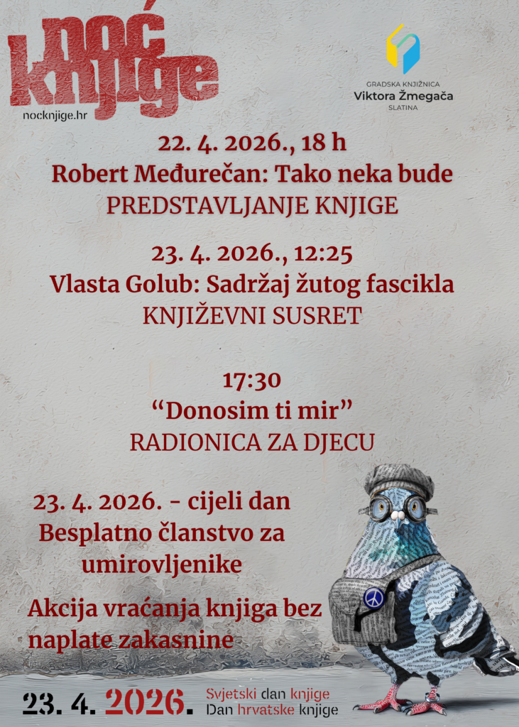 Povodom Svjetskog dana knjige i Dana hrvatske knjige, Gradska knjižnica Viktora Žmegača Slatina pripremila je bogat program za sve generacije. Pozivamo vas da nam se pridružite i zajedno s nama proslavite ljubav prema knjizi i čitanju.