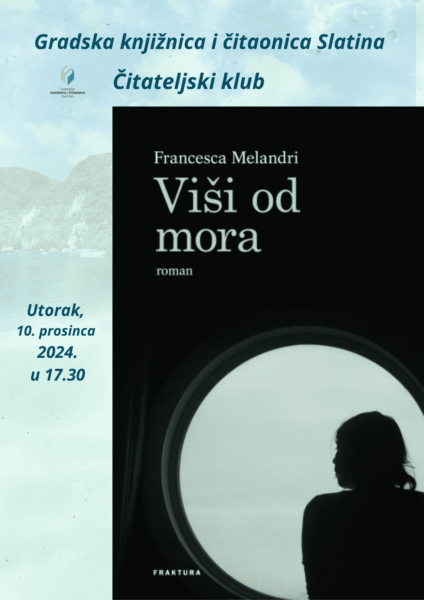 Za 86. susret Čitateljskog kluba za odrasle Gradske knjižnice i čitaonice Slatina, održanog 10. prosinca 2024. godine, članice su pročitale roman „Viši od mora“ talijanske spisateljice Francesce Melandi. Autorica je za ovaj roman, kao i za romane koje i naša knjižnica posjeduje u svom fondu, dobila niz nagrada (romani „Eva spava“, „Prava krv“). U Zahvali romana spisateljica ističe da je u pisanju ove knjige istraživala, sakupljala svjedočanstva mnogih osoba, od : „bivših zatvorskih čuvara, bivših terorista, bivših zatvorenika kaznionica s najvišim stupnjem sigurnosti, sudaca i rodbine žrtava političkoga nasilja“.