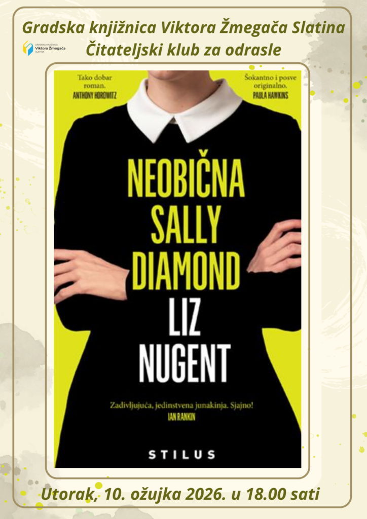 U utorak, 10. ožujka 2026. održan je novi susret članova Čitateljskog kluba za odrasle Gradske knjižnice Viktora Žmegača Slatina.  Čitali smo  roman „Neobična Sally Diamond“ irske spisateljice Liz Nugent,  knjiga je izašla u izdanju izdavačke kuće „Stillus knjiga“  iz Zagreba.   Za svoj književni rad spisateljica je dobila mnoge nagrade.