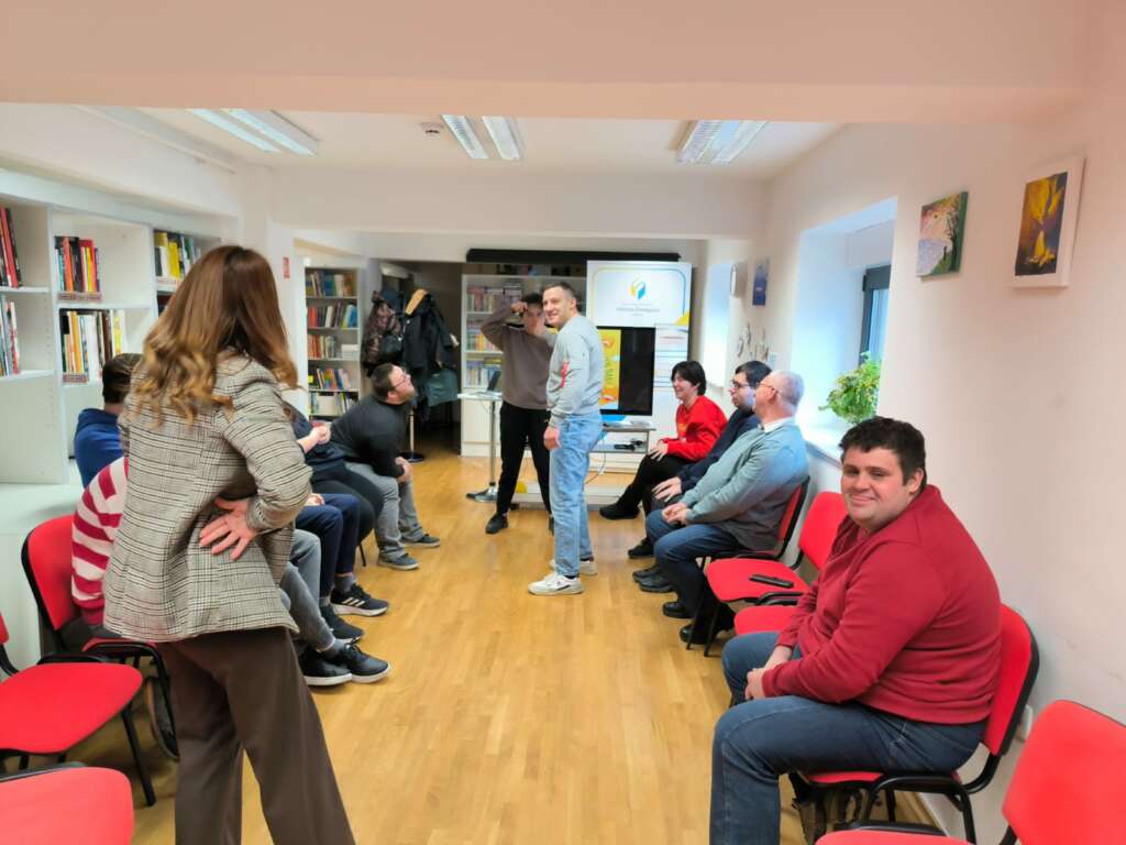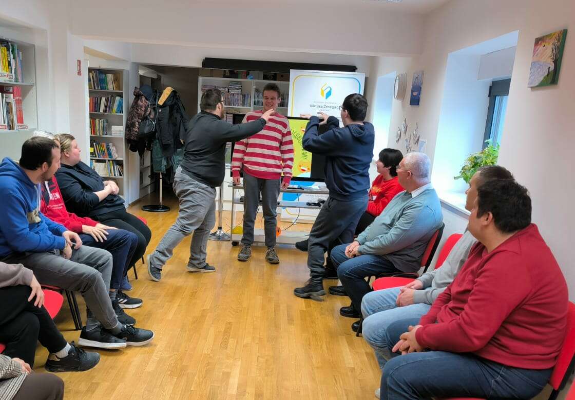 Druženje smo dodatno obogatili zanimljivim igrama koje su nam mamile osmijehe: prepoznavanjem poznatih ličnosti pod smiješnim maskama, igrom prepoznavanja glasa prijatelja, potragom za skrivenim predmetom, igrom prenošenja loptice u paru bez ruku te igrom nasmijavanja ozbiljnog prijatelja. Posljednja je igra izmamila najviše smijeha među korisnicima Udruge, ali i među knjižničarkama.