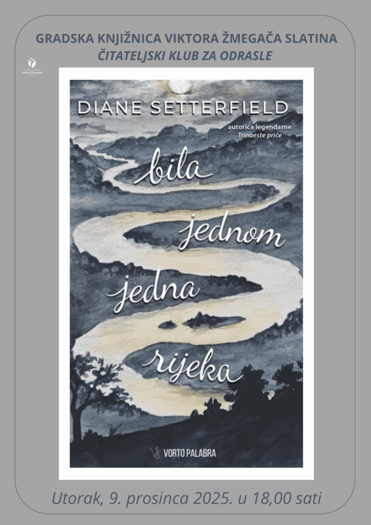 Za 95. susret Čitateljskog kluba za odrasle Gradske knjižnice Viktora Žmegača Slatina čitali smo roman “Bila jednom jedna rijeka“ poznate engleske spisateljice Diane Setterfield. Ono što nas je oduševilo kod ovoga romana je način pripovijedanja i stil pisanja kojim se spisateljica poslužila da bi ispričala priču. U knjizi nalazimo rečenicu: „Postoje priče koje se može pripovijedati naglas i one koje treba pričati šaptom, a postoje i priče koje se ne pripovijedaju nikada.“ Sve tri priče nalazimo u romanu, realne i mistične.